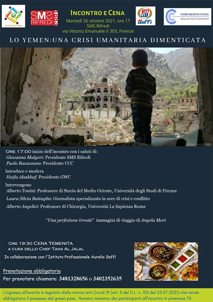Questa tragedia umana è stata definita come la più grave emergenza umanitaria in corso, e di cui, purtroppo, si parla poco e si sa ancora meno. Da qui il titolo che abbiamo scelto per questo incontro in cui cercheremo di dare qualche informazione e far conoscere il Paese. Nello Yemen non ci sono solo conflitti e carestie, ma è anche un paese ricco di storia, tradizione, paesaggi e bellezze naturali, per non parlare della gente. Lo Yemen è una parte significativa del Medio Oriente che, a sua volta, è significativo e decisivo per il resto del mondo e in particolare per l’Europa. Non solo per la sua posizione geografica ma anche per tutta una serie di fattori politici, economici ma anche sociali che non possono essere ignorati o trascurati.